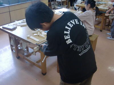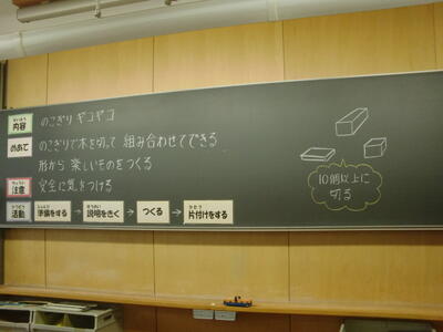 4年2組では図工科「のこぎりギコギコ」の学習に取り組みました。