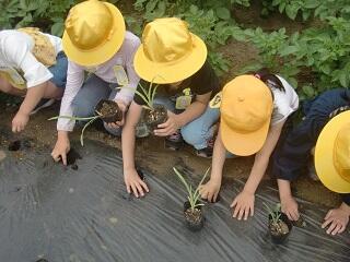 苗をていねいにもち、「大きく育ちますように」と願いをこめながら植えました。