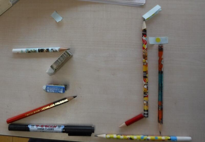 ふでばこの 中に あるものだけで 「同」という かん字を つくっていました。