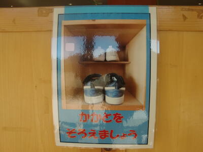 その後、生活指導主任が「くつのかかとをそろえて置きましょう」という話をしました。靴のかかとを揃えることは、心を整えることのきっかけにもなります。先週から写真入りの掲示をおこない、児童に呼びかけてきたところ多くの児童が意識をするようになりました。これからも継続していきます。