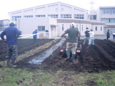 昨日、トラクターやマルチを張る機械を持ち込んでいただき、教員とともに準備を進めました。