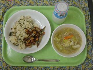 牛乳 高菜ごはん きびなごと大豆の甘辛揚げ タイピーエン
