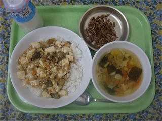牛乳 なす入りマーボー丼 わかめとコーンのスープ ココアアーモンド