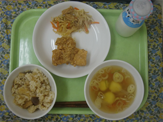 牛乳 里芋ごはん 厚揚げのにんにく味噌かけ もやしと油揚げの和え物 月見汁