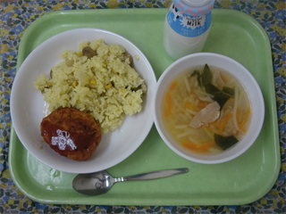 牛乳 カラフルピラフ 豆腐のナゲット じゃがいもとベーコンのスープ