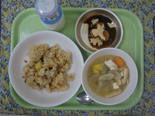 牛乳 秋の香りごはん 根菜ごま汁 きなこのお月見団子