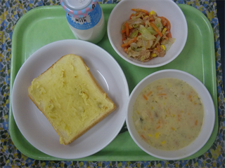 牛乳 お芋トースト コーンとキャベツのサラダ 豆乳ポタージュ