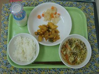 牛乳 ごはん いかと大豆のチリソース コロコロ大根ナムル もずくとたまごの中華スープ