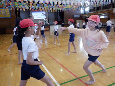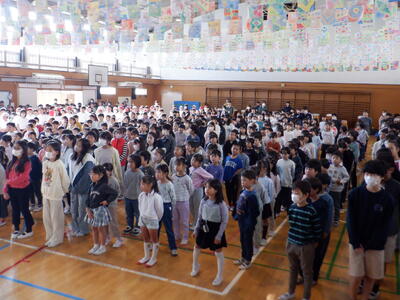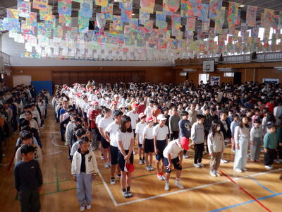 全校作品の「みんなの旗」が吊るされていて、体育館に入ってきた子たちから歓声が上がります。