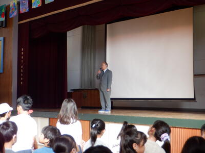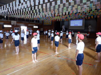 通常はリモートで行っている全校朝会を今回は体育館で行うためです。