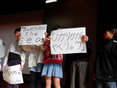 展覧会実行委員会の6年生たちが何回も集まって話し合った「Juntoku the sea」と「光り輝く竜」のイメージに沿った作品を全たて割り班で協力して作ります。