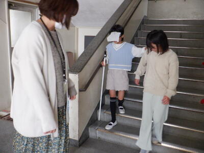 白杖体験をする子と介助をする子でペアを組み、慎重に歩いていきます。