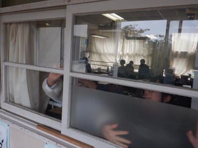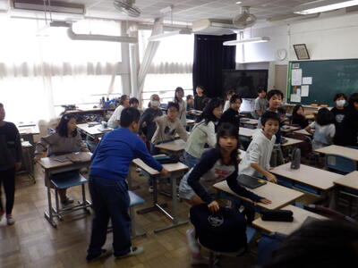 各教室では、窓、ドアを閉め、内側からカギをかけ、ドアから一番遠い場所にまとまって身を隠します。