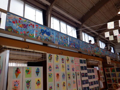 今回の大きな目玉の1つは、「子供たちがつくる」展覧会にすべく、たて割り班を生かした、全校児童による共同作品「Juntoku the sea」と「光り輝く竜」です。