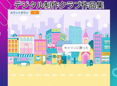 玄関の「潤徳小デジタルサイネード」では、デジタル制作クラブの有志の児童がプログラミングしたScratchのゲーム画面を流しました。