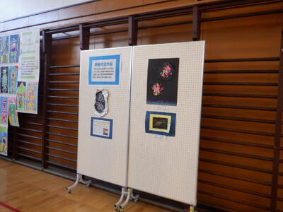 これまで、展覧会場は、ご来校いただく方々の楽しみを半減させてしまうことになるので、公開を控えていましたが、行事の終了に伴い、様子を公開したいと思います。(とは言っても、名札が貼ってあるため、個人情報保護の観点から、作品のアップの公開はできないのですが・・・。)
