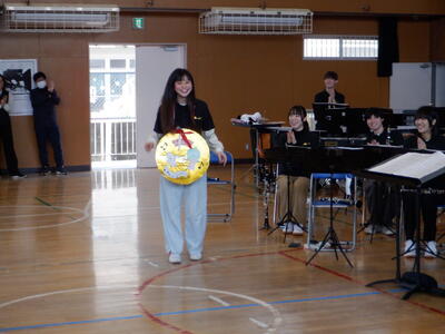 「MJリターンズ!」に向け、準備をしてくださった団員の方々へ、全国大会銀賞を祝して、児童会本部役員の手製の「特大金メダル」が団長の方にプレゼントされました。