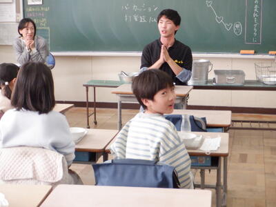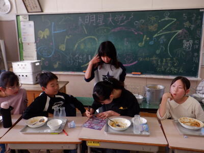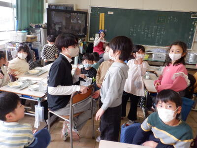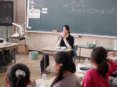 その後、全学級に都合のつく楽団の方に入っていただき、一緒に給食の「潤徳カレー」を召し上がっていただきながら交流を深めました。