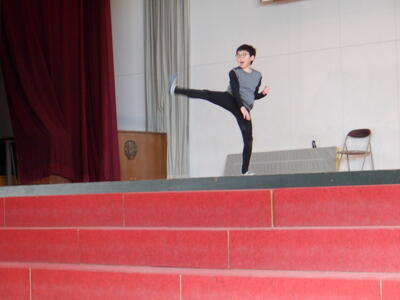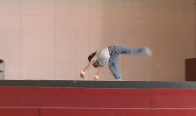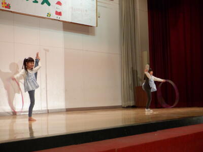 9番目は5年生による「ロンダート(側方倒立回転跳び1/4ひねり後向き)」の大技の披露です。