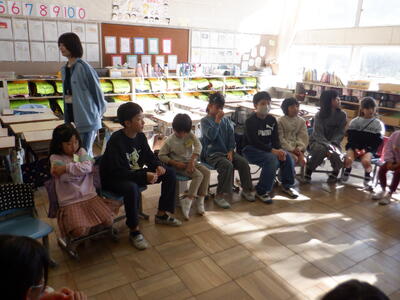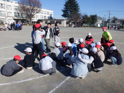 室内遊びでは、1年生の隣に5年生が座って、フォローをしてあげたり、椅子取りゲームの進行に必要な音楽のスタート/ストップを5年生に任せたりする班もありました。