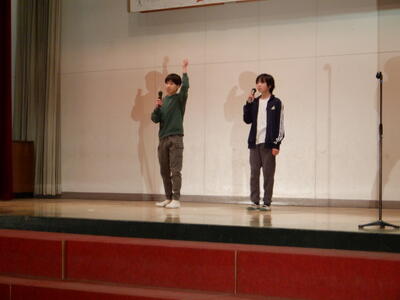まさかの、これまでの本校での活動をネタにした「3人漫才」を披露!