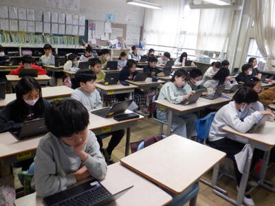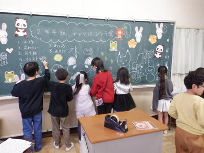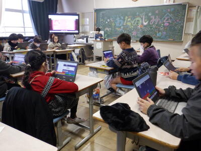 3年生の教室の黒板に「お楽しみ会」と書いてあるので、入ってみると、全員Chromebookを開いて真剣に画面を見ています。
