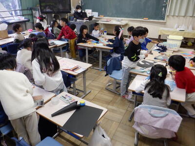班の仲間と相談しながら楽しく作業を進める1年生たち。