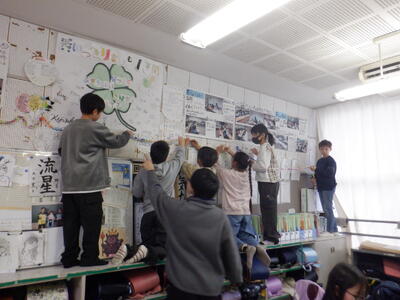 ロッカーの上に乗ってまで飾り付ける4年生たち。