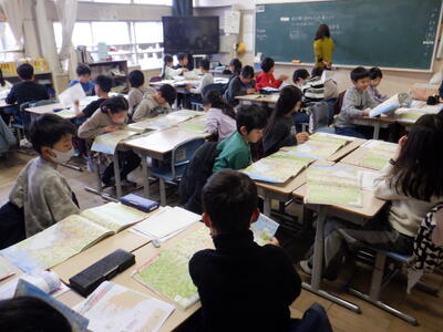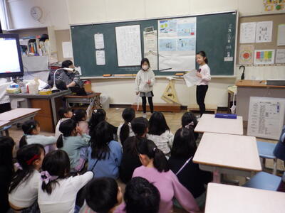 生活科で「町たんけん」をして学んだことを発表している2年生たち。