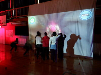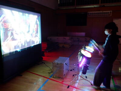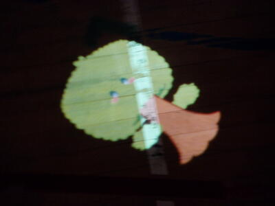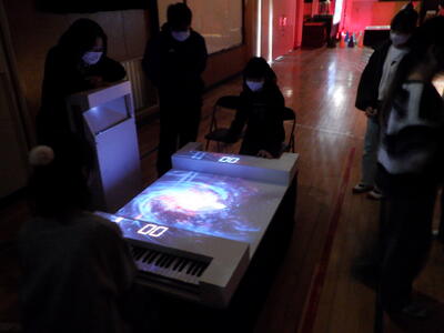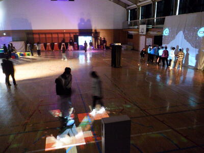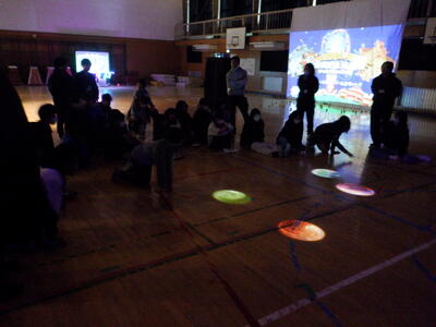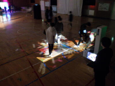 様々な方向に動いていく投影された惑星を足で踏むと、光と音が出るという体験です。