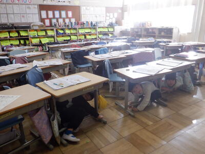 机の下に隠れ、地震の揺れが収まったら防災頭巾をかぶり、校庭に避難します。