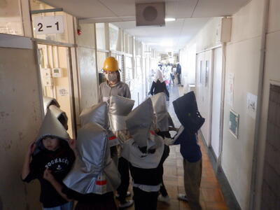 想定は、地震発生→給食室から出火→校庭へ避難というものです。