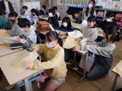重要な書類ですから、欠席児童の分も含めて、6年生が一緒に内容の確認を手伝っています。