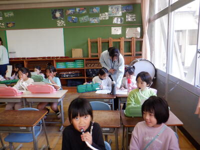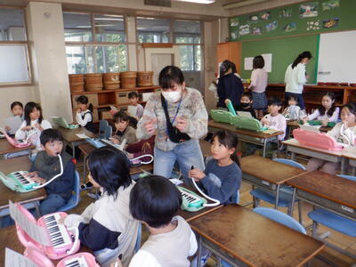 鍵盤ハーモニカ担当の1~3年生は椅子に座って練習、リコーダー担当の4~6年生は立ってアドバイスをもらいながら練習です。