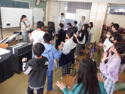 団長の方は、5年生の授業ということで、何と、5年生の「準テーマソング」とも言える「マツケンサンバ」をクラリネットで披露!
