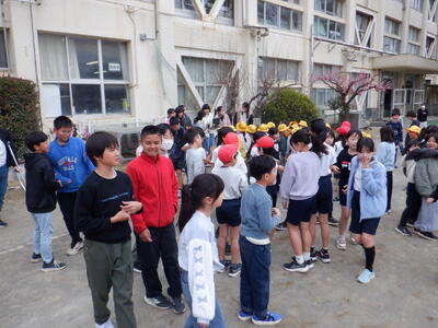 中休み、校庭にたてわり班の1~12班(1組グループ)の子たちが集まってきました。