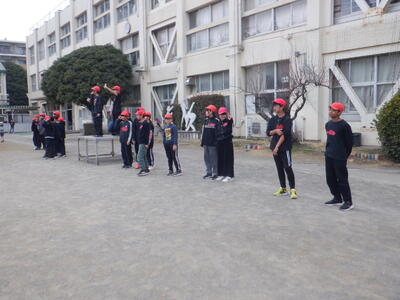 朝礼台の周りには、黒っぽい服を着て、赤い帽子をかぶった6-2の子たちが集まっています。