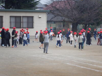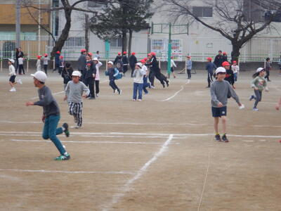 6年生に捕まる(食べられる)と帽子を赤に変え、鬼になり、白い帽子の「魚」を追いかけます。