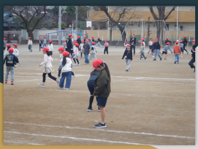 ですから、単なる「だるまさんが転んだ」ではなく、校庭全面を使った「大だるまさんが転んだ」になります。