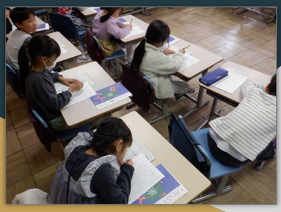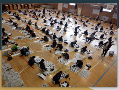 続いて、先週まで行われた、低学年の硬筆での書き初め清書、3年生以上の「席書会」の振り返りをしました。