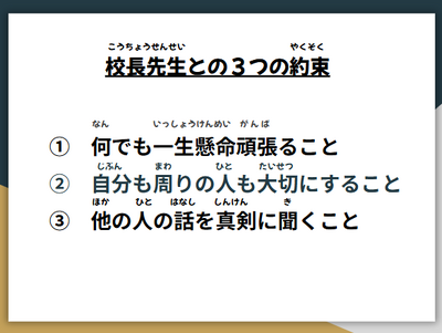 最後は、校長との3つの約束について改めて確認です。