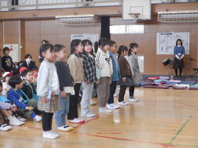 2年生たち「♪6年生すてき 6年生やさしい 6年生大好き ありが~と~う」