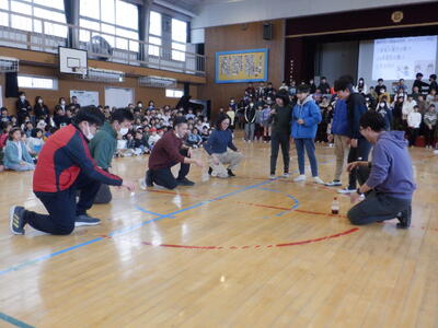 そして、「高学年先生クイズ」は、「5年担任VS6年担任のペットボトルフリップ(ペットボトルを投げ、回転させて立てる)対決」です。