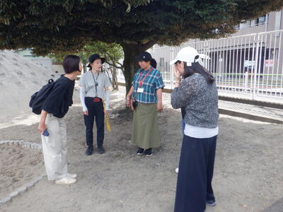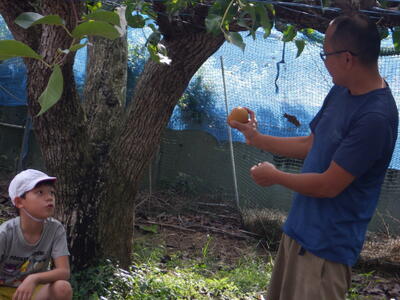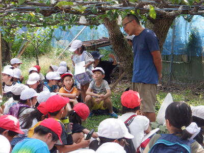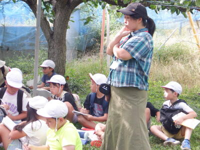 子供たちは熱心にメモをとりますが、潤ファミ先生方も「大人の社会科見学」として、梨の栽培の話に聞き入ります。