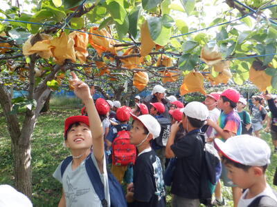たわわに実る梨を見て、子供たちからは笑顔がこぼれます。