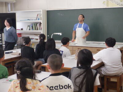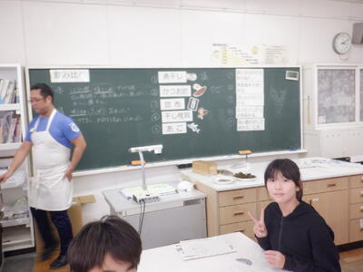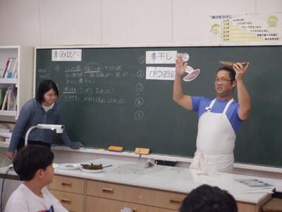 家庭科室に移動し、本校の栄養士が「だし」についての講話を行います。