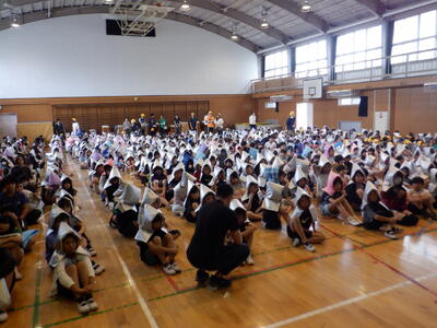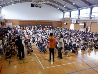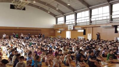 開始時刻が近付いてくると、続々と体育館に各学級の子供たちが集まってきます。