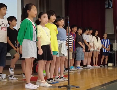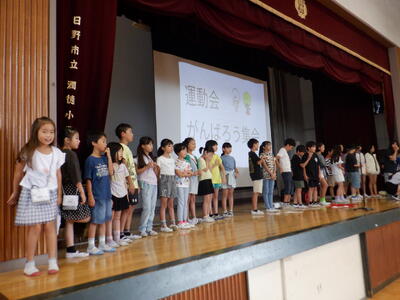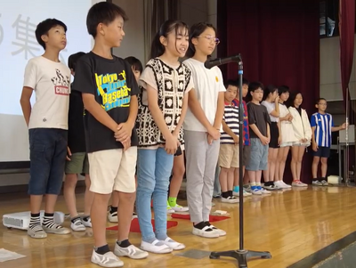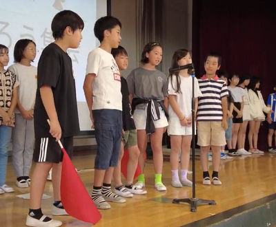 続いて、運動会実行委員たちで話し合って決めた、運動会の全体スローガンの発表です。