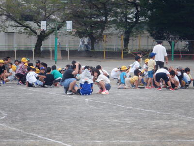 校庭にいた子たちは、真ん中に集まり、しゃがみます。