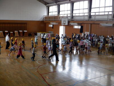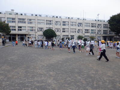 副校長「今日はとても暑く、長い時間校庭で待つことが難しいため、体育館に避難します。2次避難、開始!」